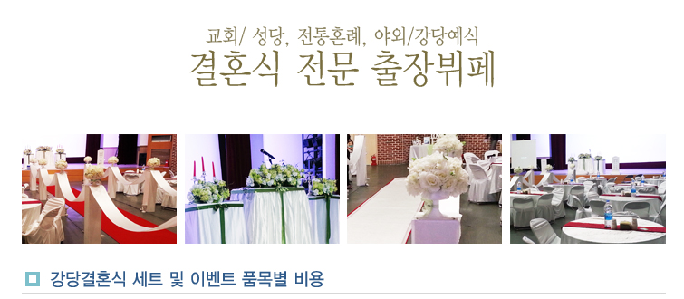 | 예식장 | 꽃길, 꽃문아치, 융단, 주례단상, 사회단상, 성혼선언문, 혼인서약서, 사회자 식순, 혼주석(양가), 하객의자, 신부대기실 | ||